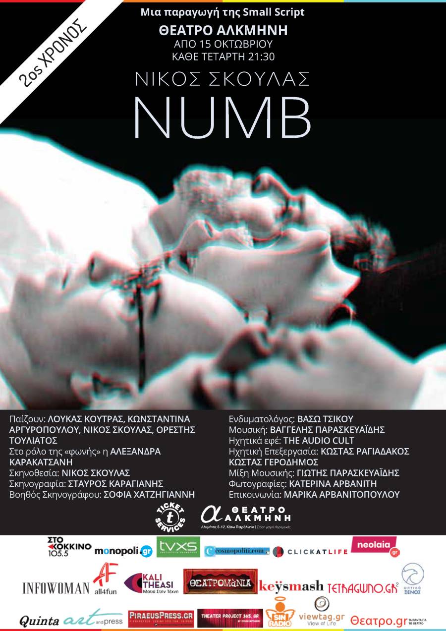 Η παράσταση «NUMB» του Νίκου Σκουλά, ο οποίος υπογράφει και τη σκηνοθεσία, ανήκει στο είδος του πειραματικού θεάτρου, με μια ιδιαιτερότητα όμως στην θεατρική της γραφή. Σαν κινηματογραφικά επαναλαμβανόμενα πλάνα, οι ιστορίες των ηρώων επιδρούν και ξεχωριστά στο θεατή αλλά και στο σύνολό τους.