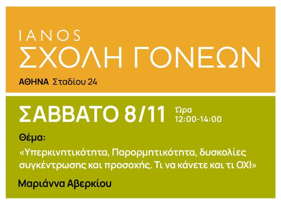 Το Σάββατο 8 Νοεμβρίου, στις 12:00-14:00 η Αλυσίδα Πολιτισμού IANOS διοργανώνει «Σχολή Γονέων» με την Καθοδήγηση, Επιμέλεια και Συντονισμό της Μαριάννας Αβερκίου (φιλόλογος, εκπαιδευτικός, υπεύθυνη παιδαγωγικού προγράμματος σε παιδικούς σταθμούς και νηπιαγωγεία, Msc στην Ειδική Αγωγή και Συμβουλευτική γονέων, PhD στη δημιουργικότητα, συγγραφέας).
