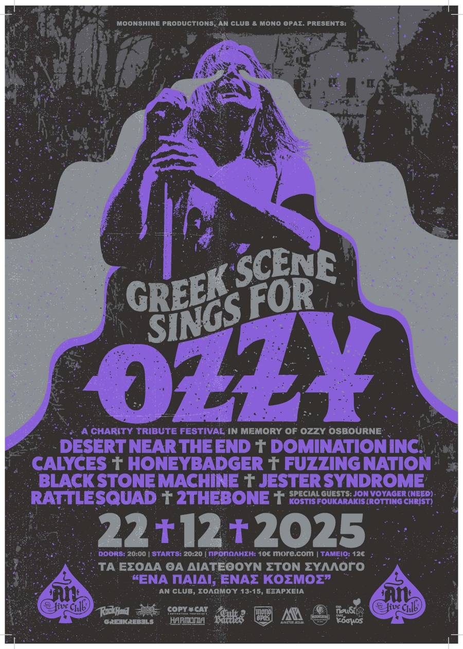 Την Δευτέρα, 22 Δεκεμβρίου 2025, συγκεντρωνόμαστε στο ιστορικό AN Club για μια ξεχωριστή βραδιά αφιερωμένη στον Ozzy Osbourne. Ελληνικά rock και metal συγκροτήματα θα διασκευάσουν κομμάτια από τη δισκογραφία του, ταξιδεύοντας μας νοερά στη βροχερή Αγγλία των 70s, εκεί όπου γεννήθηκε η μουσική μας.