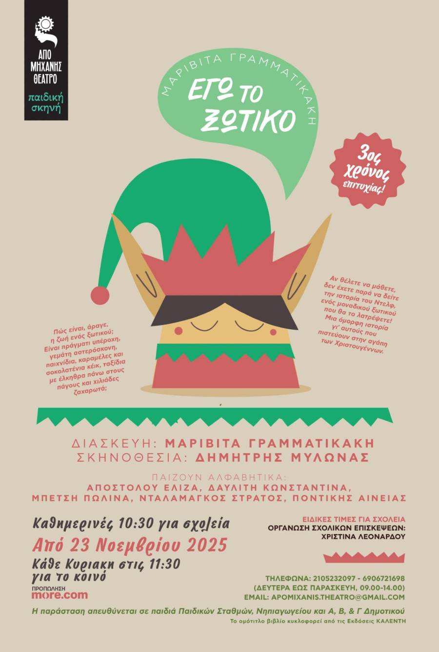 Μετά τη μεγάλη επιτυχία και τα sold-out που σημείωσε για 2 συνεχόμενες χρονιές, η ΠΑΙΔΙΚΗ ΣΚΗΝΗ του «Από Μηχανής» Θεάτρου παρουσιάζει για 3η χρονιά την παράσταση που αγαπήθηκε από μικρούς και μεγάλους «Εγώ το ξωτικό» βασισμένη στο ομότιτλο βιβλίο της Μαριβίτας Γραμματικάκη, θεατρική διασκευή της ιδίας και σκηνοθεσία Δημήτρη Μυλωνά.