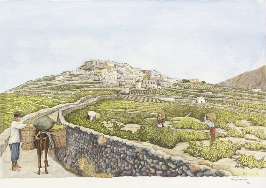 Στην έκθεση παρουσιάζονται δέκα πέντε νέα έργα της εικαστικού (όλα υδατογραφίες) αρμολογημένα σε ένα ιστορικό αφήγημα, μέσα από τους τελετουργικούς κύκλους της παράδοσης, των κύκλων εργασίας, της τοπικής οικονομίας, των εθίμων και του συλλογικού θυμικού. Ο επισκέπτης θα αναγνωρίσει πτυχές μιας Σαντορίνης που επιβιώνει όχι μόνο στη μνήμη και στην προφορική μαρτυρία, αλλά και στο ανάγλυφο του τοπίου, στην αρχαία γη, στην γραμμή του ορίζοντα, στην παράδοση του οίνου και της αμπέλου, στα γεωργικά προϊόντα, στη χλωρίδα και στους κύκλους του χρόνου, στην αρχιτεκτονική, που διατρέχει τη στερεότυπη εικόνα της Σαντορίνης μέσα από εκλάμψεις αυθεντικότητας και αρχέγονης σοφίας. Στην έκθεση παρουσιάζονται επίσης τέσσερα παλαιότερα έργα της εικαστικού με θεματική συνάφεια, εμπνευσμένα από τις τοιχογραφίες του Προϊστορικού Οικισμού του Ακρωτηρίου, που υποδηλώνουν την αρχέγονη εξάρτηση του ανθρώπου από τα στοιχεία της φύσης και τους τελετουργικούς κύκλους της.