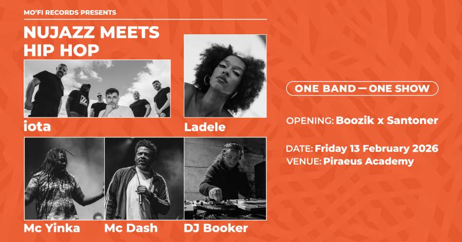 Η MO’FI Records παρουσιάζει: Nu jazz meets hip hop: One Band, One Show, με τους iota, η Ladele, οι Urban Lynx (MC Yinka και MC Dash) και ο DJ Booker να μοιράζονται στη σκηνή του Piraeus Club Academy ως μία ενιαία μπάντα, παρουσιάζοντας ένα δυναμικό concept live που συνδυάζει nu jazz, hip hop, live instruments, ηλεκτρονικά layers και turntablism και ενώνει διαφορετικούς μουσικούς κόσμους, με grooves, φωνητικά, rap, αυτοσχεδιασμούς και δυνατή ενέργεια πάνω στη σκηνή.