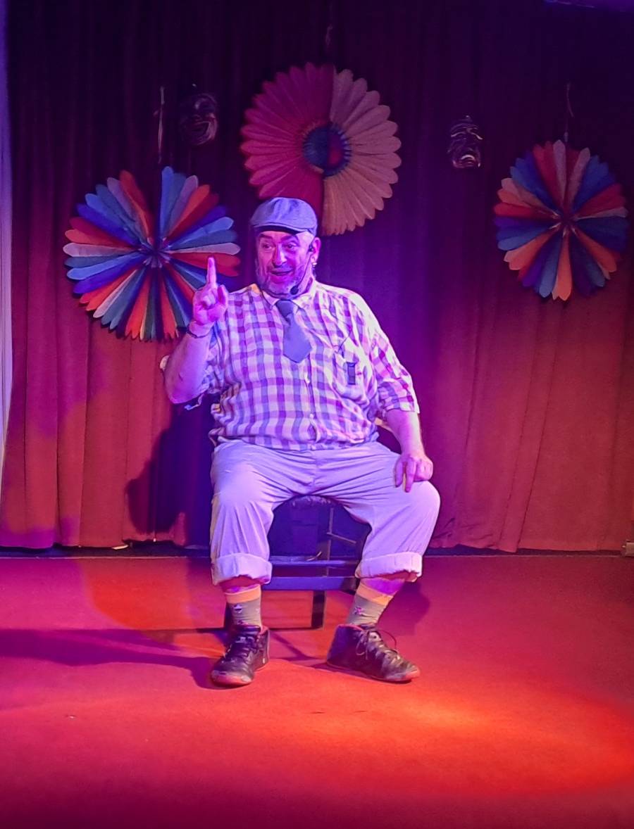 H παράσταση πραγματοποιείται στο φουαγιέ μας και οι θεατές παρακολουθούν σε τραπεζοκαθίσματα.