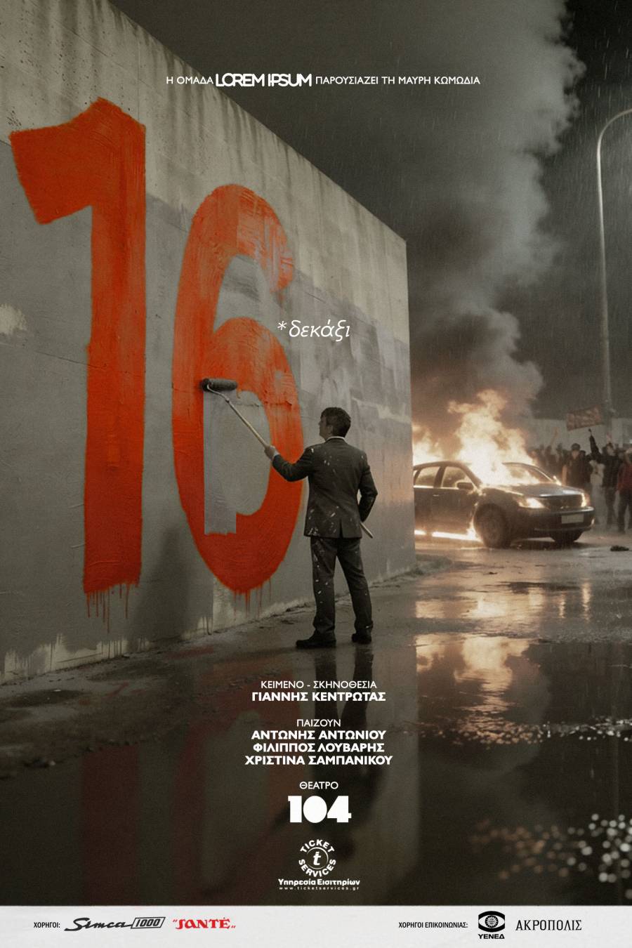 Ο Γιάννης Κεντρωτάς (Ο τόρνος, Γιοσίρου Γιαμαγκούσι, Αλάσκα, Πιγκάλ, Η Λεμονιά) επιστρέφει σκηνοθετικά με την ομάδα του LOREM IPSUM με ένα σύγχρονο κείμενο, ανατρεπτικό και ευφάνταστο στο black box του θεάτρου 104.