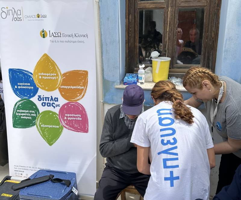 Ο κόσμος συρρέει στο κέντρο υγείας, εκεί όπου στήνονται τα ιατρεία, ενώ στα μικρά νησιά όπως η Ψέριμος και η Τέλενδος, τα ιατρεία στήνονται στον περιβάλλοντα χώρο, σε ελαιώνες, αμπελώνες ή κάτω από γιγάντιους φίκους. Μέσα στη φύση κάτω από τον γαλανό ή συννεφιασμένο ουρανό. Την ώρα η κτηνίατρος αντιμετωπίζει μια κύστη στο πόδι ενός κόκορα, ο πνευμονολόγος κάνει σπιρομετρήσεις, οι παιδίατροι εξετάζουν, ο γυναικολόγος διενεργεί τεστ ΠΑΠ, οι ΩΡΛ αφαιρούν κερί από τον ακουστικό πόρο των κατοίκων, οι οδοντίατροι κάνουν σφραγίσματα ή και εξαγωγές δοντιών και όλο το νησί είναι μαζεμένο εκεί όπου οι εθελοντές της Σύμπλευσης αλλάζουν προς το καλύτερο τις ζωές τους. Επίσης γίνονται αιματολογικές εξετάσεις, από νωρίς το πρωί, με τα δείγματα να μεταφέρονται και να αναλύονται στην Ιασώ Γενική Κλινική, η οποία προσφέρει αυτήν την πολύτιμη υπηρεσία στους νησιώτες στο πλαίσιο του προγράμματος εταιρικής κοινωνικής ευθύνης «δίπλα σας», του Ομίλου Ιασώ και της Ιασώ Γενικής Κλινικής.