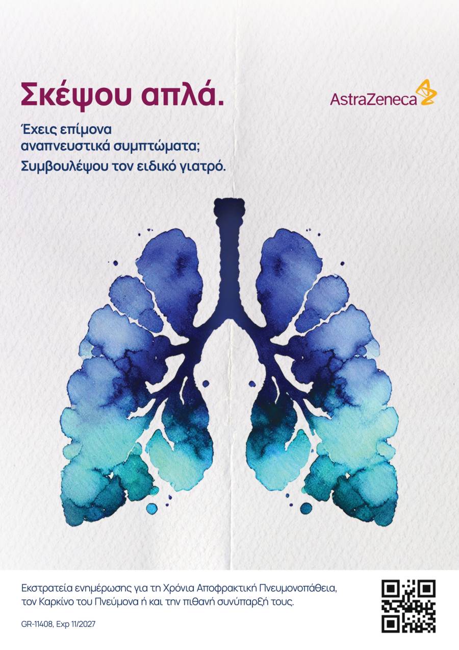 Ισχυρή πρωτοβουλία για την Φροντίδα των Πνευμόνων από την AstraZeneca για την προώθηση της υγείας των πνευμόνων, με δύο κεντρικούς πυλώνες: την ενημερωτική εκστρατεία «Σκέψου απλά» και την υπογραφή τριών μνημονίων συνεργασίας με κορυφαίες ελληνικές επιστημονικές εταιρείες, την Εταιρεία Ογκολόγων Παθολόγων Ελλάδας (ΕΟΠΕ), την Ελληνική Εταιρεία Καρκίνου του Πνεύμονα (ΕΛΕΚΑΠ) και την Ελληνική Πνευμονολογική Εταιρεία (ΕΠΕ). Η πρωτοβουλία δίνει ιδιαίτερη έμφαση στη συχνή συνύπαρξη του Καρκίνου του Πνεύμονα με τη Χρόνια Αποφρακτική Πνευμονοπάθεια (ΧΑΠ)— μια σχέση που συχνά δεν αναγνωρίζεται έγκαιρα, αλλά επηρεάζει καθοριστικά τη διάγνωση και τη συνολική φροντίδα των ασθενών.