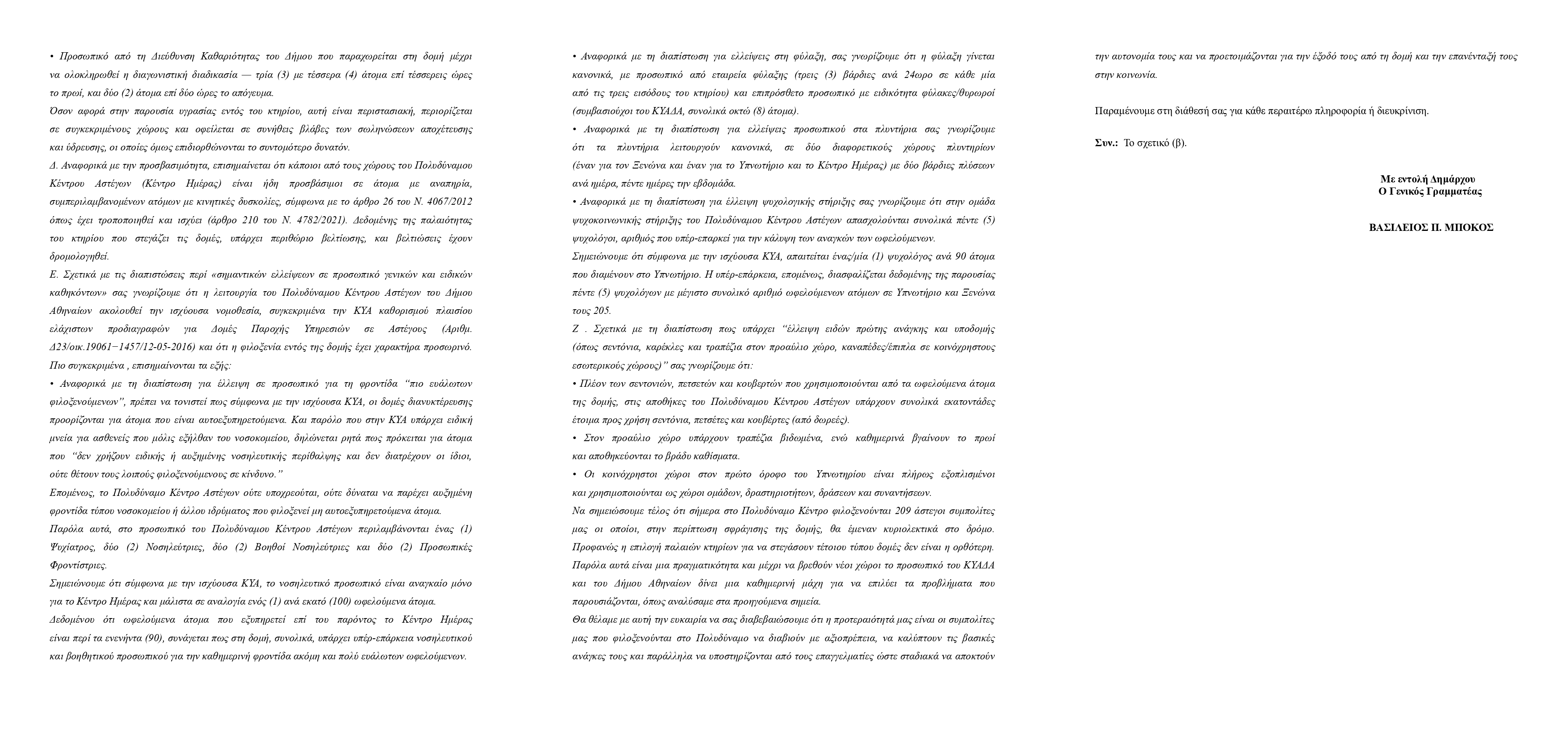 Δ. Αναφορικά με την προσβασιμότητα, επισημαίνεται ότι κάποιοι από τους χώρους του Πολυδύναμου Κέντρου Αστέγων (Κέντρο Ημέρας) είναι ήδη προσβάσιμοι σε άτομα με αναπηρία, συμπεριλαμβανομένων ατόμων με κινητικές δυσκολίες, σύμφωνα με το άρθρο 26 του Ν. 4067/2012 όπως έχει τροποποιηθεί και ισχύει (άρθρο 210 του Ν. 4782/2021). Δεδομένης της παλαιότητας του κτηρίου που στεγάζει τις δομές, υπάρχει περιθώριο βελτίωσης, και βελτιώσεις έχουν δρομολογηθεί.