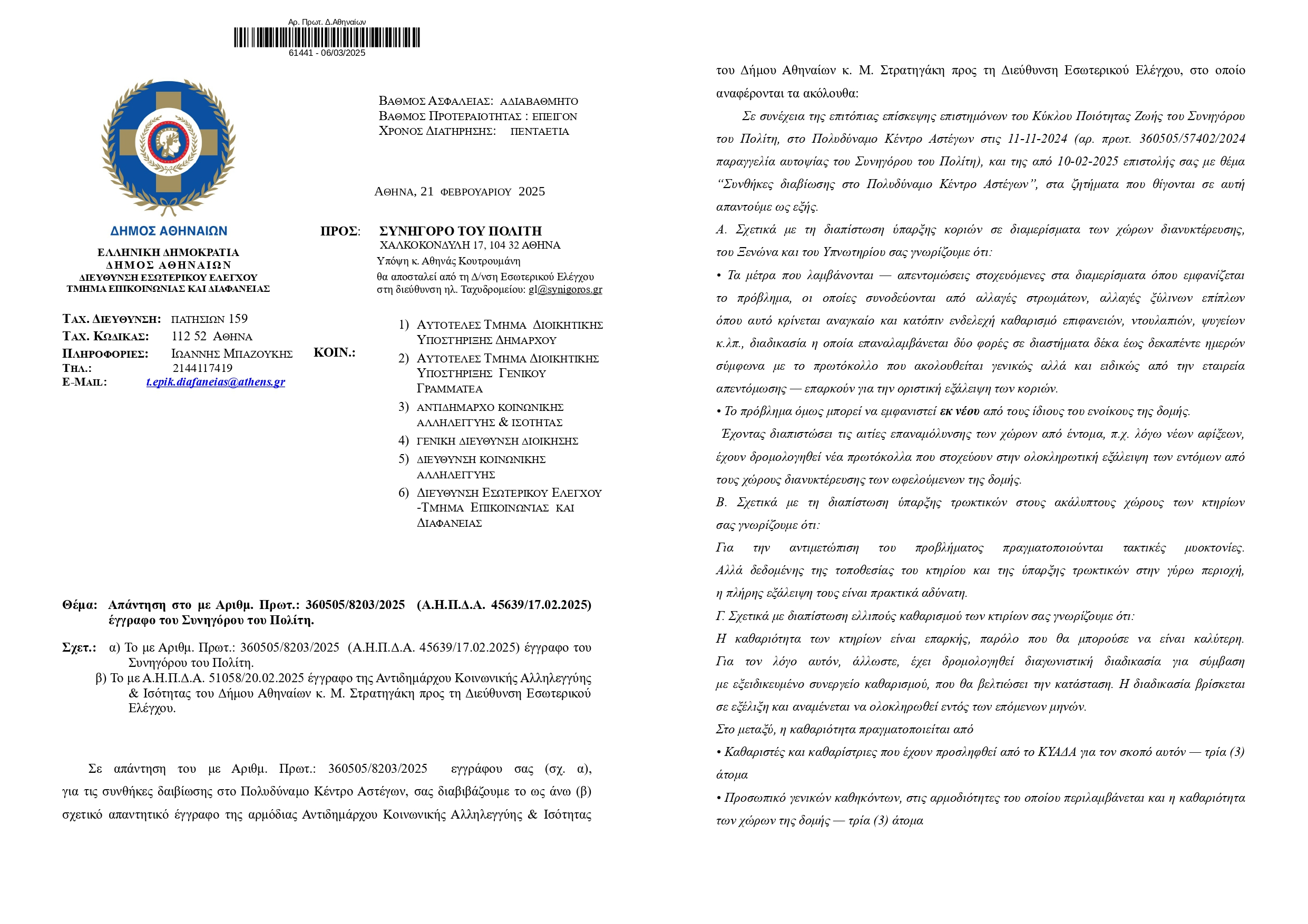 Σε απάντηση του με Αριθμ. Πρωτ.: 360505/8203/2025 εγγράφου σας (σχ. α), για τις συνθήκες δαιβίωσης στο Πολυδύναμο Κέντρο Αστέγων, σας διαβιβάζουμε το ως άνω (β) σχετικό απαντητικό έγγραφο της αρμόδιας Αντιδημάρχου Κοινωνικής Αλληλεγγύης & Ισότητας του Δήμου Αθηναίων κ. Μ. Στρατηγάκη προς τη Διεύθυνση Εσωτερικού Ελέγχου, στο οποίο αναφέρονται τα ακόλουθα: