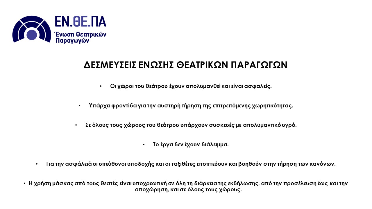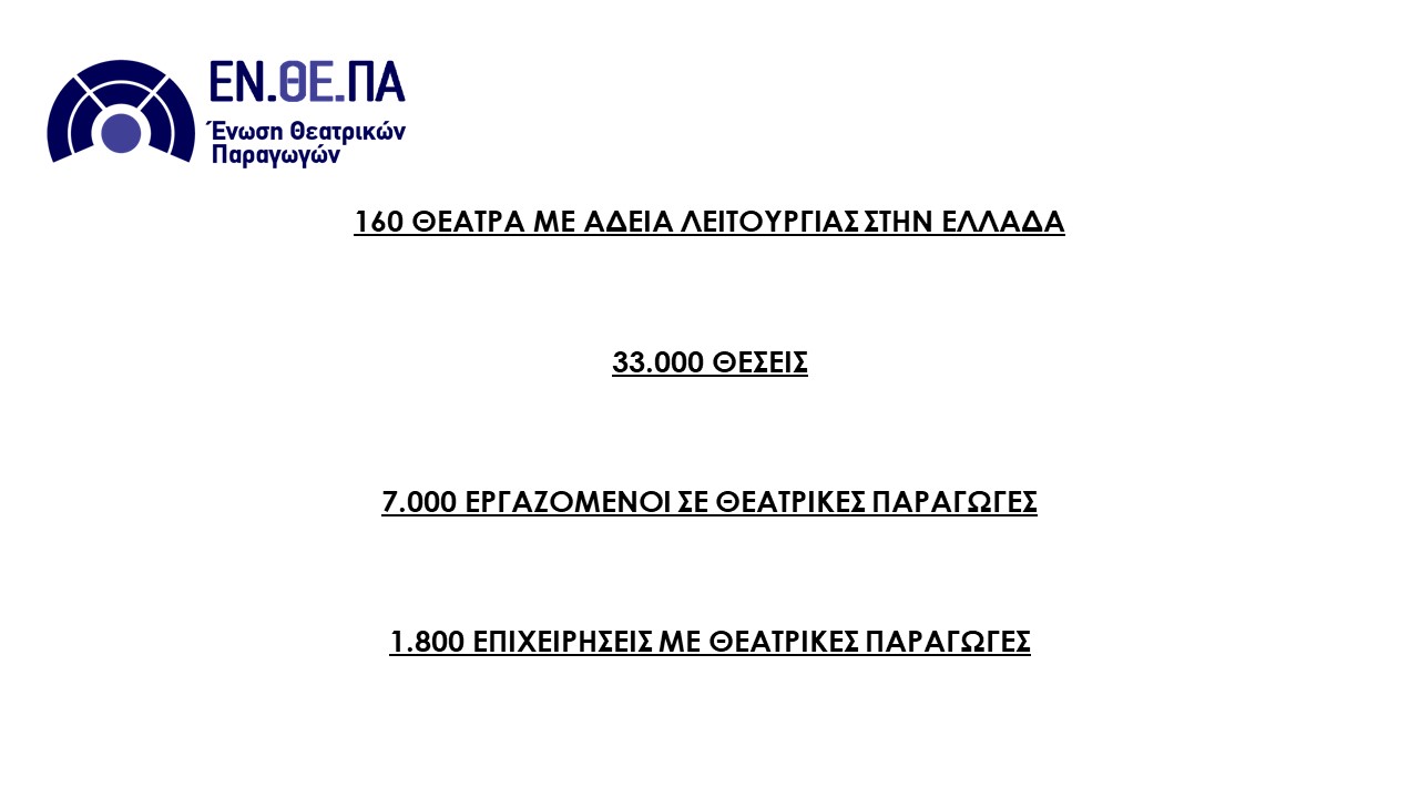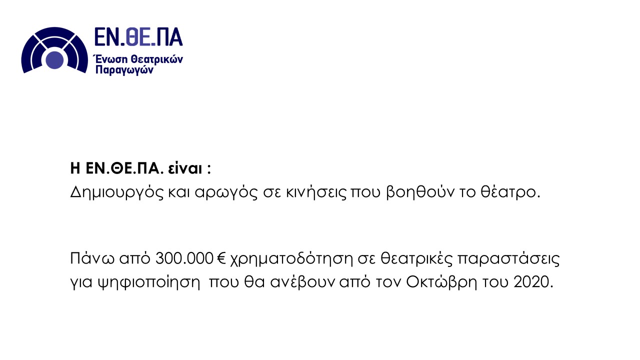 Η ΕΝΘΕΠΑ - ΕΝΩΣΗ ΘΕΑΤΡΙΚΩΝ ΠΑΡΑΓΩΓΩΝ προσπαθεί από την ημέρα που συστάθηκε να αναδείξει τα προβλήματα τουθεατρικού χώρου, να μελετήσει και να προτείνει λύσεις,ώστεαυτός ο χώρος να επιβιώσει με τις λιγότερες πληγές απότην πανδημία.